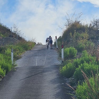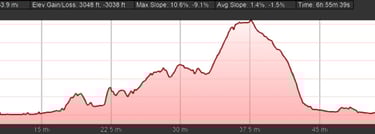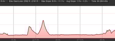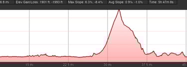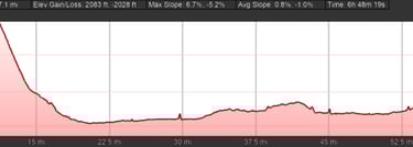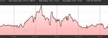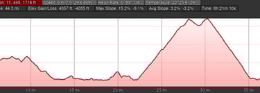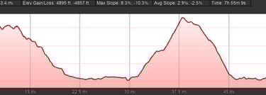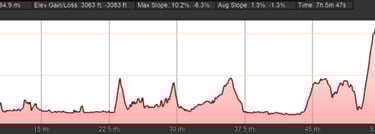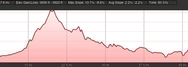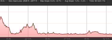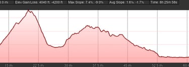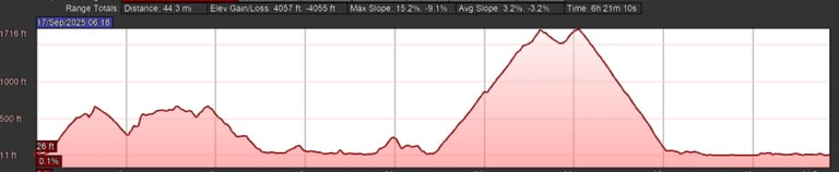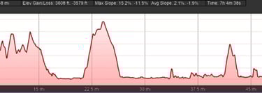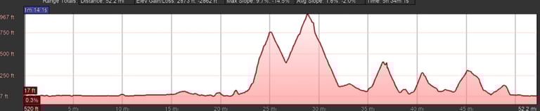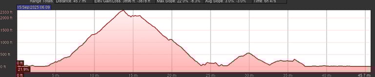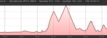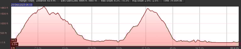 This was a much more challenging day than expected. While the main climb was a 500m ascent between 23 and 29 miles, the hilly section in the first 10 miles was very difficult in places with gradients exceeding 20% for short sections.