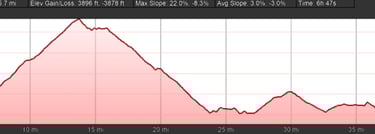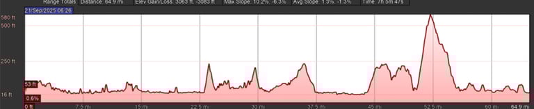 Distance 65.7 miles: Total Ascent = 968 m (3,175 ft)*
