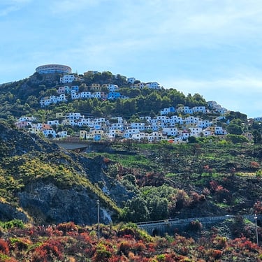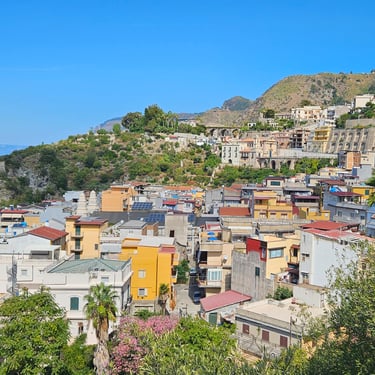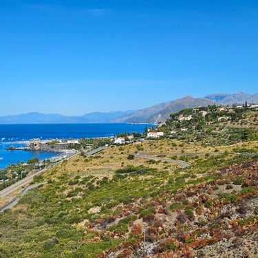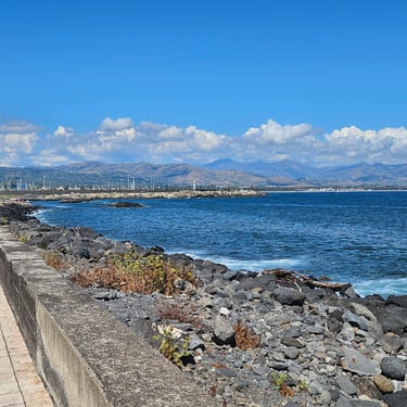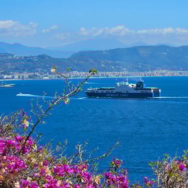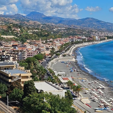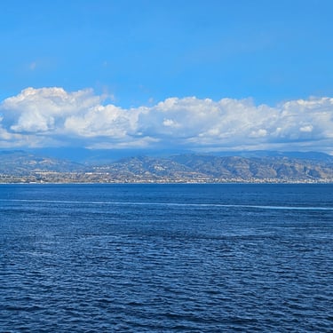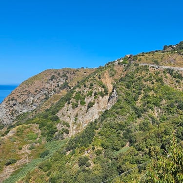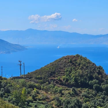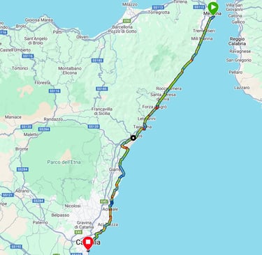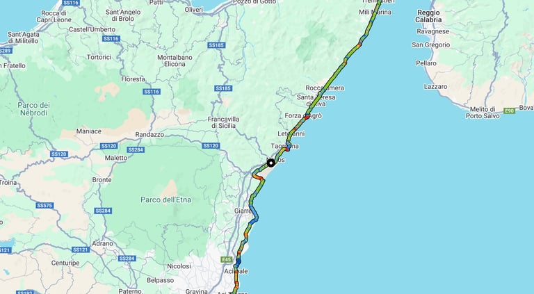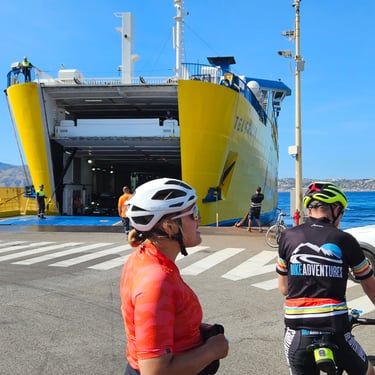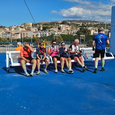 This was a challenging day of two parts either side of a ferry. The first objective was about 59 miles to the ferry terminal and included two substantial climbs to over 500m. The first started soon after leaving the hotel to a summit at about 9.5 miles while the second was between 32 and 39 miles in the heat of the day. The second part of the day was about two miles in Messina from the ferry to the hotel.