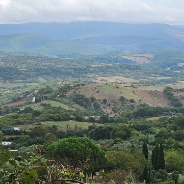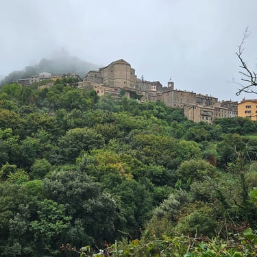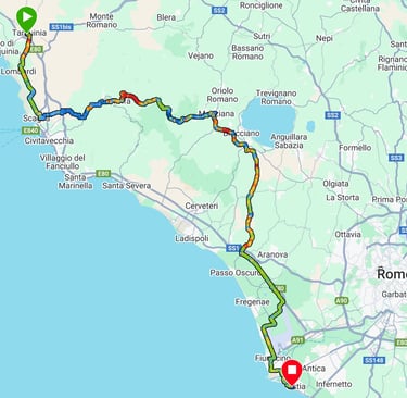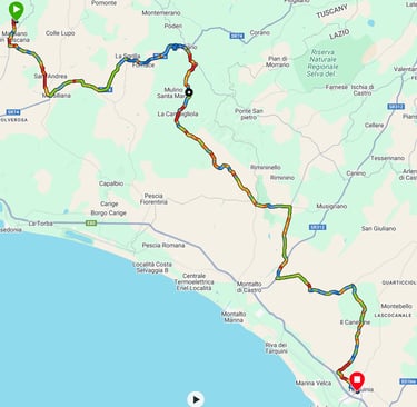 Breakfast was available from 7am and we were cycling soon after 8am in damp weather. The day included two significant hills. The summit of the first was about 525m at 20 miles and the second was 325m at about 35 miles. Consistent with my policy of trying to get through the most challenging part of the day before a proper refreshment stop I had identified a bakery in Manciano at the top of the second hill. I started the day in my waterproof jacket and overshorts but took them off after an hour as the weather had dried and the route started to climb. We had passed near the main port for the Rome area which had a power station, imported vehicles and docked cruise liners.