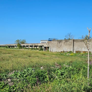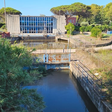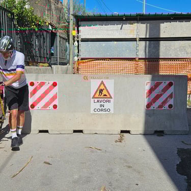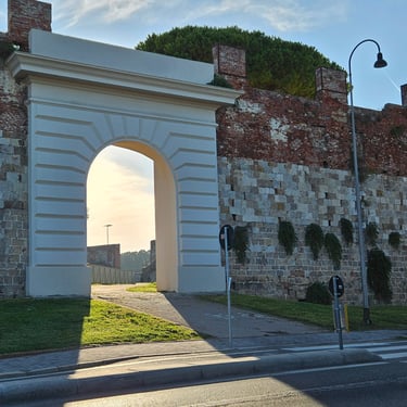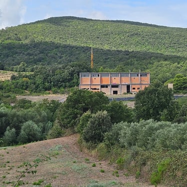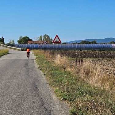 Breakfast was available from 7am and we started from the hotel at about 08:20. Breakfast was fine except that there was no sign of any tea. Sunday morning Pisa streets were fairly free of vehicles and runners and cyclists fairly numerous. I made a brief stop to photograph a section of the old city wall in which there was what appeared to be a new archway. There were then two further brief stops to make minor adjustments to my saddle orientation before we progressed from Pisa onto fairly quiet roads. One interesting feature we encountered some miles south of Pisa was a very long and low building. My best guess was that it was a cover over a conveyor belt. Subsequent research revealed that it was part of the European gravity wave detector.