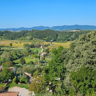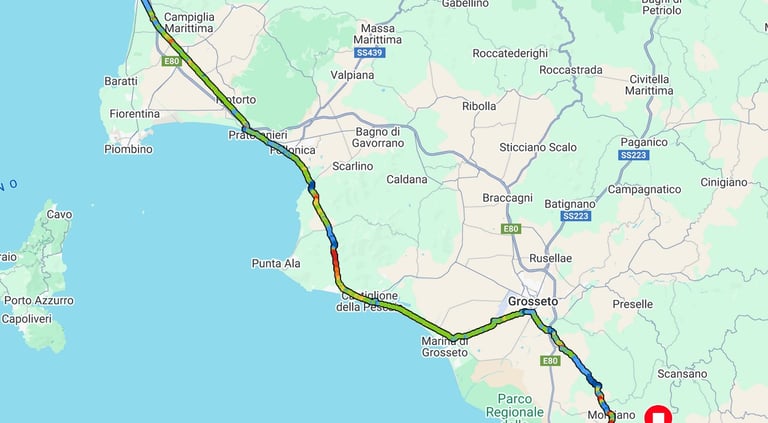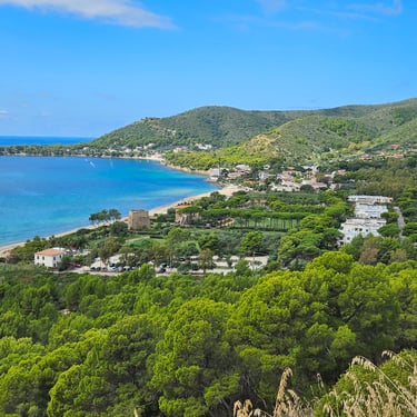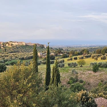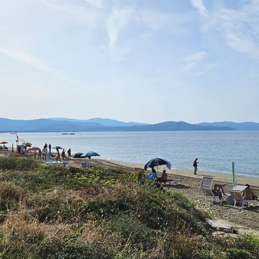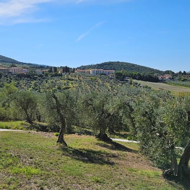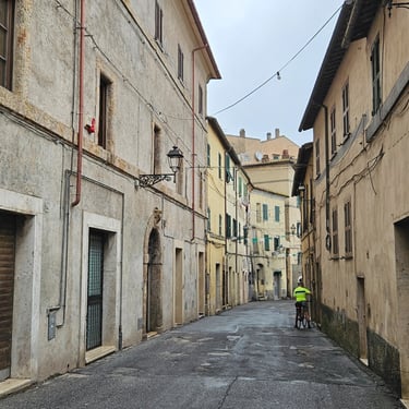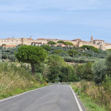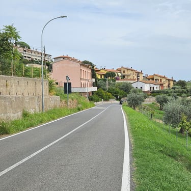 After the hilly area the route dropped to about 40m before we had to climb again to the Borgo Magliano Garden Resort which was in the hills close to Magliano. The access road to the resort contained the steeped hill of the trip - bottom gear was needed. The hotel was a sprawling place and our room was a bit cave-like. There was a short heavy shower late afternoon which caused a dash to rescue drying clothes. Dinner was a buffet costing €29 per person, but I refilled my plate numerous times.