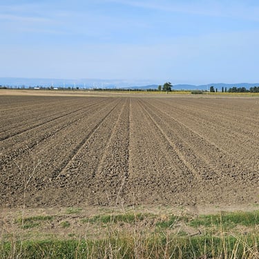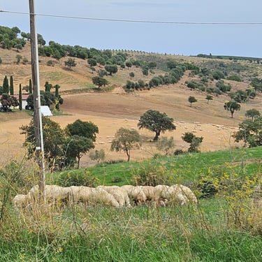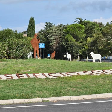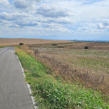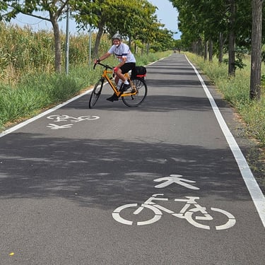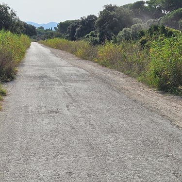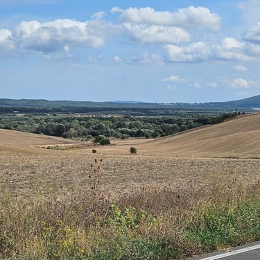 Between 38 and 43 miles we used the cycling equivalent of a motorway - smooth and generously wide (wider than many British roads). This passed to the south of a military airbase where the peace was periodically interrupted by small and noisy jet planes. We then passed through the corner of the large town of Grosetto where I spotted a bench in a park to use for the lunch stop. Soon after lunch the route started to climb to an altitude of almost 200m. Fortunately, some high cloud eased the heat. The hilly section provided a welcome change of scenery and, for the first time on the trip, we saw some sheep.