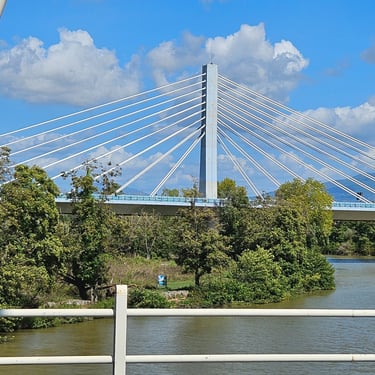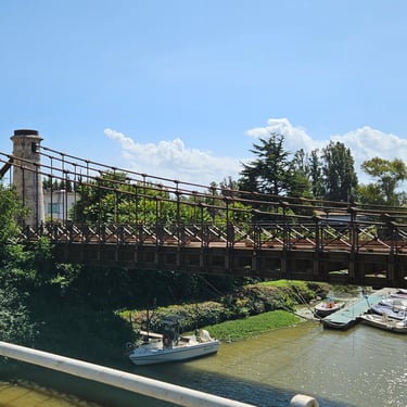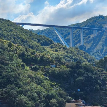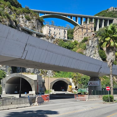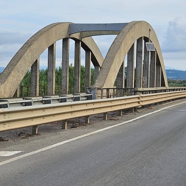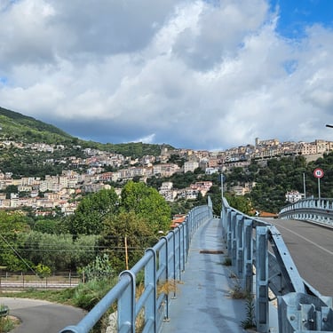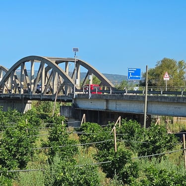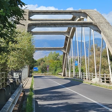 After Itri there was a pleasant descent which didn't require use of brakes to moderate speed. Part way down we passed under an impressive viaduct which research revealed used to carry a railway to the coast. Towards the end of the ride we passed over a concrete bridge of a more sensible design with steel hangers between the deck and the concrete arches. Upstream of this bridge is a modern cable-stayed bridge while downstream is dilapidated suspension bridge.