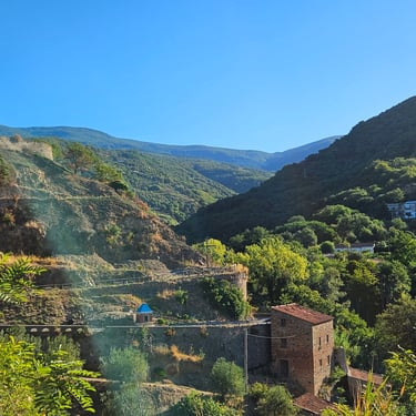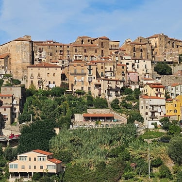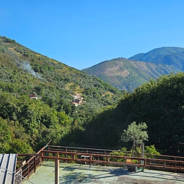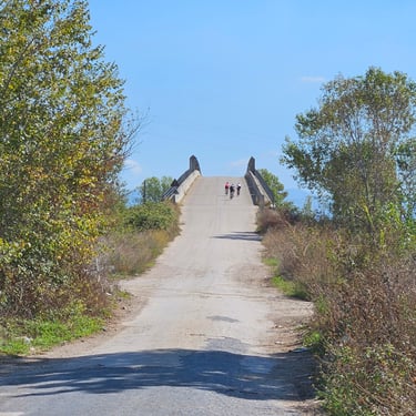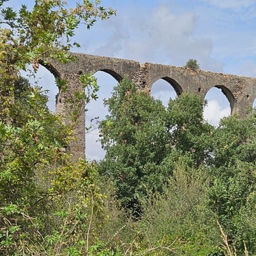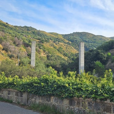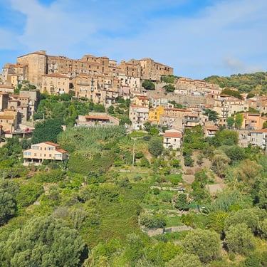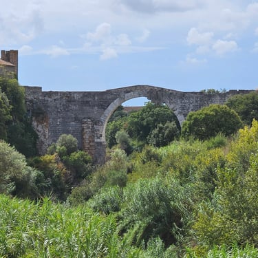 Breakfast was available from 7am (there was a good view of Magliano in the early morning sunshine) and we were on our bikes just before 8:30. After a few miles I stopped to photograph an unusual concrete bridge. Having the arches in concrete was sensible , but concrete hangers in tension was not a normal design choice (I had seen similar bridges in Eritrea which had been built by the Italians). I had identified a bakery in Manciano (at the top of the climb) where we could get some supplies for consumption later on where there were few on-route refreshment options.