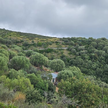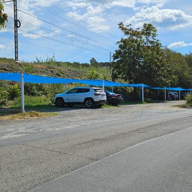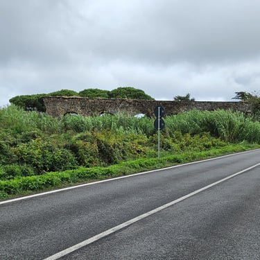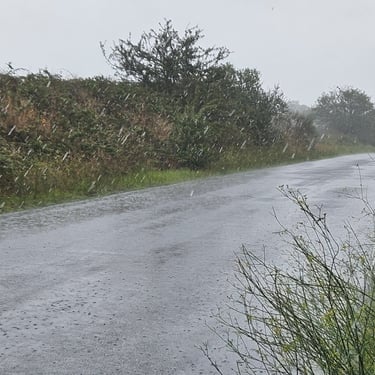 The route in the hills provided a variety of scenery including a massive quarry. After the refreshment stop we embarked on a long and undulating descent where progress was hampered by a noticeable headwind. We could see an ominous black cloud ahead but, at about 1:30pm, were surprised by heavy rain coming from our right side which triggered a dash for the shelter of a tree. We continued after putting on waterproofs and the rain moderated. I was getting a bit warm when we reached the coastal area and removed my waterproofs. However, at about 3pm we were surprised by another dose of pressure-washing and, in the absence of any shelter, opted to continue. Richard was still wearing his jacket while I had a waterproof gilet. The latter was clearly not designed for this type of rain and, while my shorts had a water-repellant treatment, it became ineffective within a few seconds. The result was a soggy cyclist and a soggy saddle. My feet, however, were happy to be splashed by warm water from the large puddles.