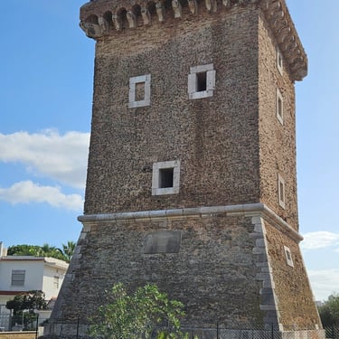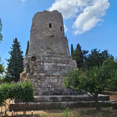Soon after that we stopped in a gateway for our lunch then not long after that there was a ruined aqueduct on the right side of the road. Eventually the town of Tarquinia came into sight and we found the Hotel Villa Tirreno. Our room had a generous balcony which was used for bike storage (and an annoying air conditioner which would turn offf each time the door to the balcony was opened). We had been asked to pre-order our dinner at the hotel. I didn't like the look of the menu and Richard had found there was a nearby pizzaria. In early evening we walked up the hill to see the old city wall and then had a pizza.