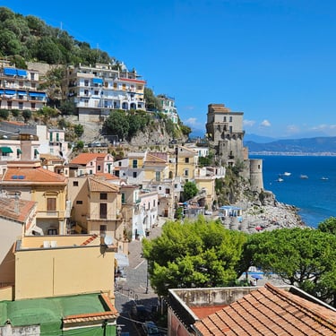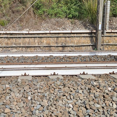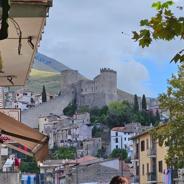 The heat from the sun was occasionally moderated by cloud and good progress was made on a good road along the coast for the first 15 miles before turning inland. At 19 miles the route then took us on some less good, but quieter, roads of which six miles ran parallel to the railway (I noted that the Italians paint their rails white presumably to reduce heating by the sun). At 28 miles we joined a main road for the climb over the hill. It was a comfortable climb with the sunshine sometimes moderated by cloud and/or trees. The riders ahead of us were at a very good cafe in Itri where we had an early lunch of freshly made to order large cheese and ham rolls. The cafe also provided a good view of the castle on the hill.
