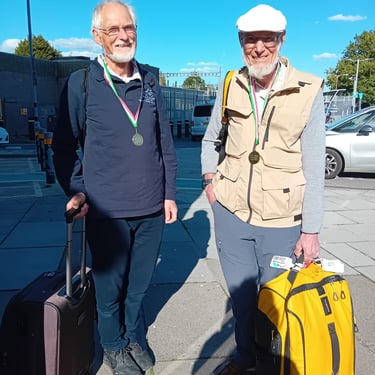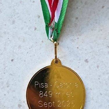 The journey home was one of the easiest I've done after one of these cycling trips. Easyjet to Bristol was at a convenient mid morning time after which there was a bus trip to Bristol and a train ride to Swindon. We were greeted by Richard's wife who had very thoughtfully arranged medals for us and I was conveyed home by car (although I had my bus pass ready).