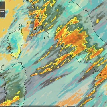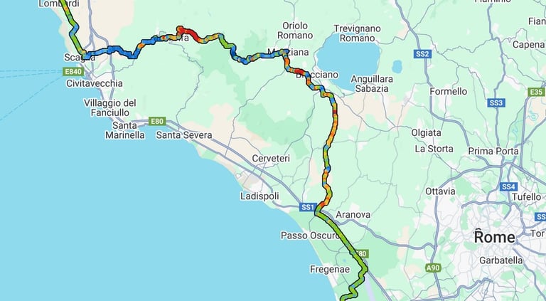 At about 77 miles this was the longest day on the trip with more hill climbing than the previous 3 days. This is as near as we get to Rome. The weather forecast anticipated thundery showers which encouraged four of the group to travel by train. In reality the weather was damp at the start after an overnight thunderstorm, then dry for several hours until a downpour at about 1:30pm which faded to light rain until another downpour at 3pm. A consequence of the unsettled weather was much cooler temperatures not exceeding 25C. A weather map for Italy showed 24 hour cumulative rainfall up to 6pm between 50 and 100mm.