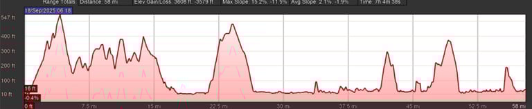 Distance 58.0 miles: Total Ascent = 1,134 m (3,720 ft)*