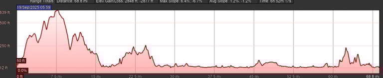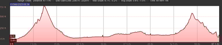 Distance 68.3 miles: Total Ascent = 663 m (2,175 ft)*