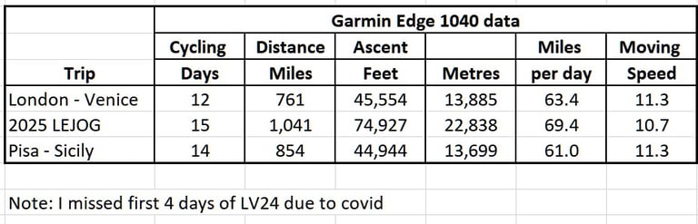 I was very worn out and spent the next week trying to figure out what had made this trip more arduous than the LEJOG although the latter was much more challenging in terms of distance and climbing. I identified several factors, the main one being heat. I suspect the wind which, while rarely strong, was predominantly between south and south west was cumulatively energy-sapping while the primary objective of the final days was to get out of the heat as quickly as possible. The final three days of the ride were both hot and almost straight into the wind. I also wonder if some less copious hotel meals reduced rebuilding of energy reserves.